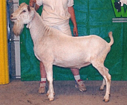 Arabas is inbred on Perfection Snolan. He brings two of the most successful Saanen herds together – Two Ceders and Lake Country. His offspring were strong, level, dairy with good milk production. Although Arabas did throw color (limited number), he is one of the few purebred Saanen semen available. He was selected for ADGA’s Young Sire Development Program with an ETA of -10 / -66. He appraised 90 (VEE) as a three year-old.